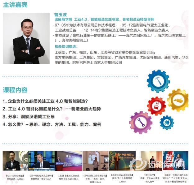 2018年金諾濟南機床展開展在即,配套推出《工業4.0與企業智能化轉型》培訓課程,由榮登央視的智能制造實踐專家、著名制造業轉型導師曾玉波親臨現場,進行授課與指導。