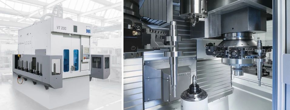 EMAG的倒立車的單機(jī)自動(dòng)化程度高,這次展會(huì)展出的VT200雙刀架軸類立式車床,集成了帶工件架的鏈?zhǔn)捷斔蛶Вㄟ^(guò)集成在兩個(gè)刀塔上的機(jī)械手從工件傳輸帶上抓取毛坯件,并垂直送入車床中,完成加工后,通過(guò)另一個(gè)刀架上的機(jī)械手將工件取出,實(shí)現(xiàn)單機(jī)自動(dòng)化上下料。