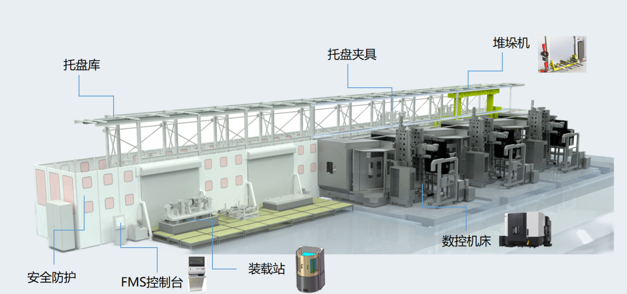力鼎智能SRM-FMS柔性制造單元,主要由堆垛機(jī)、托盤庫(kù)、裝載站、機(jī)床、柔性控制系統(tǒng)等組成,通過(guò)動(dòng)態(tài)的生產(chǎn)排程、柔性靈活的工藝配置,使固定的機(jī)床設(shè)備變?nèi)嵝宰冹`活,能夠加工不同品種的工件、適配多種多樣的生產(chǎn)場(chǎng)景。柔性制造單元控制系統(tǒng)YDCMES-FMS具有柔性配置、動(dòng)態(tài)控制、生產(chǎn)監(jiān)控、三維仿真、異常處理等功能,實(shí)現(xiàn)黑燈工廠生產(chǎn)。