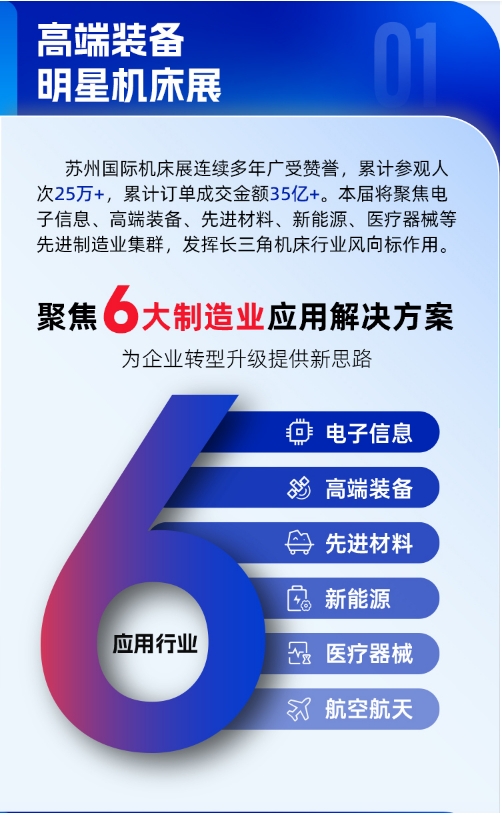2024年第六屆蘇州國際機(jī)床展將圍繞四大王牌產(chǎn)業(yè),聚焦電子信息、高端裝備、先進(jìn)材料、新能源、醫(yī)療器械等先進(jìn)制造業(yè)集群,發(fā)揮長三角機(jī)床行業(yè)風(fēng)向標(biāo)作用,全面實(shí)施工業(yè)智造強(qiáng)基提質(zhì)行動(dòng)。