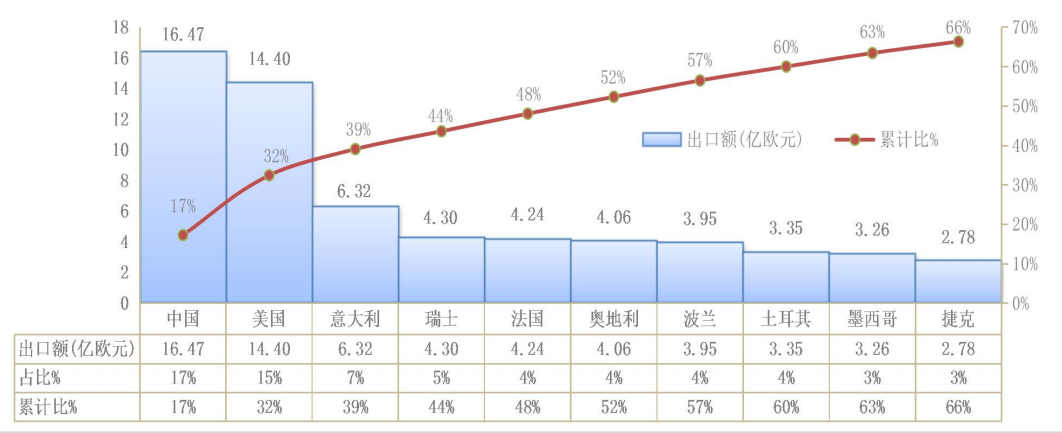 根據德國機床制造商協會(VDW)數據,2023年德國機床產值152.4億歐元,超過日本,成為繼中國之后第二大機床制造國。2023年是德國機床出口的豐收年,機床出口額95.08億歐元,同比增長9%;出口率69%,超過中國、日本成為全球最大的機床出口國。2023年德國出口額排名前10的國家(地區)情況如下(單位:億歐元)。