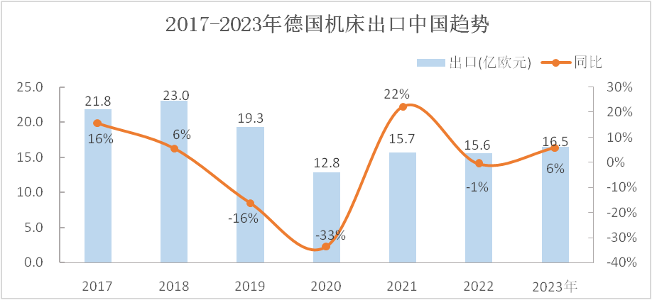 2023年德國對中國的機床出口額達16.47億歐元,出口額占比最高,達17%,同比增長6%。受疫情影響,2020年德國對中國機床出口降至谷底,目前正在逐步恢復中。