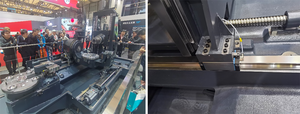 恒輪機床(常州)有限公司(Heller)參展的HF 5500機型,在提供高精度、高動態性能五軸聯動加工的同時,集成了車削加工、滾齒加工、刮齒加工等功能,滿足客戶在各種領域的加工需求,帶托盤更換裝置或工作臺裝載功能,通過工件或托盤自動化實現自動化。NC旋轉工作臺配有反向軸承和AB運動系統,具有最低的質量慣性矩,可實現快速定位。根據筆者與其現場工程師溝通,HELLER機床在組裝時,通過鑄件調整基本精度要求達到0.01mm以內,再反復通過墊片調整,實現最終的高精度。為了減少螺釘偏轉帶來的鎖緊力不足等問題,關鍵鎖緊部位(如線軌滑塊)都采用了半圓墊片,為了減少三軸熱變形可能帶來螺桿的扭曲,其螺桿組設計結構采用傳動端固定,尾端采用滾針軸承進行支撐,采用光柵尺實施閉環補償,進而減少扭曲力矩,保證精度的穩定性。此機床X/Y/Z軸行程900/950/930mm,快速位移達65m/min,可加工工件(直徑/高度)φ900/870mm,標配定位精度0.004mm,重復定位精度0.002mm,如客戶定制,最高可壓縮至定位精度0.002mm,重復定位精度0.001mm,帶支撐軸承的旋轉數控轉臺和帶高動態扭矩驅動的AB運動軸作為標配,單工作臺選配機型可配車轉臺,可實現銑車復合功能。