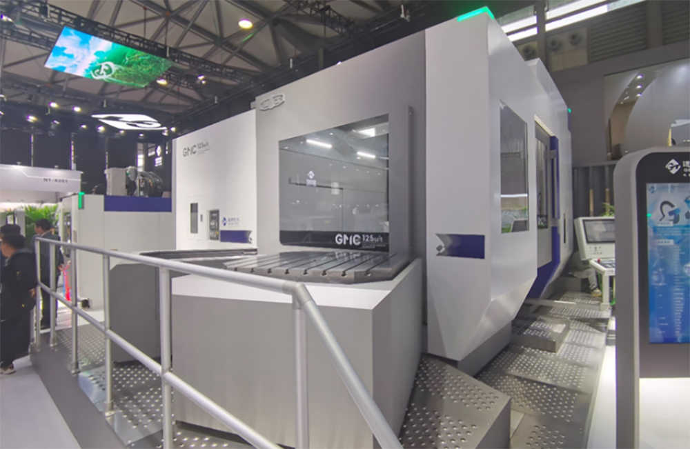 中國通用技術(集團)控股有限責任公司展出的GMC125u/t五坐標加工中心采用臥式叉式單擺結構,實現五軸聯動。整體床身底座、單立柱式結構,拖板帶動擺頭移動,整機熱對稱設計,同時對機床熱特性和熱源分布建立熱補償模型,對機床熱變形進行補償,提升熱穩定性。X、Y、Z坐標運動導軌采用重載滾柱直線導軌,立柱導軌采用三導軌支撐結構,工作臺回轉運動驅動形式采用主從電機,雙向消除間隙,豎直軸采用氮氣平衡機構,配置容量為120把矩陣式機器人刀庫,拓展性強,便于實現車間級中央刀庫自動管理,通過功能模塊組合實現機床的五坐標加工及五軸聯動車銑復合加工功能,快速響應用戶不斷變化的需求。此機床工作臺尺寸1250mm×1250mm,承重為2500kg,加工最大零件的回轉直徑φ1400mm,X/Y/Z軸定位/重復定位精度為0.006/0.003mm,A/B軸定位/重復定位精度為6″/4″。