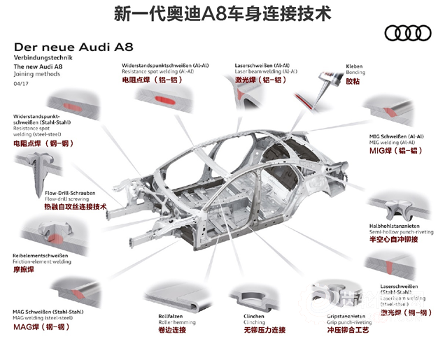 (一圖看懂新一代奧迪A8車身連接工藝,點(diǎn)擊查看大圖 - 圖片來(lái)自?shī)W迪官網(wǎng),AMTS翻譯)