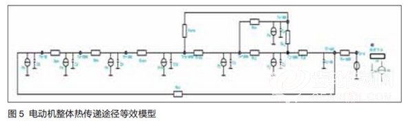 通過(guò)上述計(jì)算得等效換熱系數(shù),再根據(jù)結(jié)構(gòu)中存在的熱傳導(dǎo)與熱對(duì)流模型,可分別計(jì)算出各個(gè)零部件的熱阻、熱容等參數(shù),有了熱源、熱阻等參數(shù),根據(jù)電動(dòng)機(jī)中熱分析傳遞途徑可建立等效出熱阻網(wǎng)絡(luò)模型(見(jiàn)圖5),由模型可等效出基本數(shù)學(xué)矩陣模型最后可得出各部件的溫度場(chǎng)變化情況,即可作為完整的邊界條件計(jì)算出有效解,最后可得出總成結(jié)構(gòu)中,電動(dòng)機(jī)熱管理方案僅用定子水冷套的情況下,針對(duì)電動(dòng)機(jī)在額定工況與峰值工況下電動(dòng)機(jī)各個(gè)零部件在穩(wěn)態(tài)運(yùn)行時(shí)溫度場(chǎng)變化。