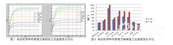 通過(guò)上文介紹,對(duì)總成結(jié)構(gòu)中電動(dòng)機(jī)兩種不同熱管理方案的溫度場(chǎng)變化對(duì)比(見(jiàn)圖7、圖8)可知,電動(dòng)機(jī)轉(zhuǎn)子軸心處引入被動(dòng)冷卻系統(tǒng)的油冷系統(tǒng)的散熱效果將有效的降低了電動(dòng)機(jī)內(nèi)部的溫差,特別對(duì)于電動(dòng)機(jī)轉(zhuǎn)動(dòng)部件。但如能在滿足電動(dòng)機(jī)本身的散熱要求情況下,只用定子水冷套熱管理方案,將大大減少了一系列問(wèn)題,例如可減少電動(dòng)機(jī)制造成本,加工工藝,及可不用考慮電動(dòng)機(jī)轉(zhuǎn)子的密封及強(qiáng)度等問(wèn)題。而如在強(qiáng)調(diào)電動(dòng)機(jī)性能效率和功率密度的前提下,對(duì)電動(dòng)機(jī)轉(zhuǎn)子軸心引入該熱管理方案將十分有效,雖其中也將面臨一系列問(wèn)題,但在強(qiáng)調(diào)集成度及功率密度比的前提下,這將是未來(lái)發(fā)展的一個(gè)趨勢(shì)。
