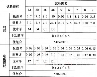 針對電火花粗加工實驗數據分析,對于時間試驗指標而言,A4、B4、C1、D1分別為B、C、D因素的優水平;對于損耗試驗指標而言,A2、B2、C2、D1分別為B、C、D因素的優水平。