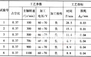 實驗條件:負極性粗加工、占空比0.37、加工電壓60~70 V,對主軸轉速做單因素實驗,實驗結果如表7所示。