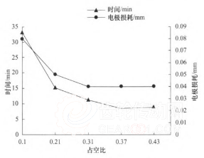 實驗條件:負極性粗加工、加工電壓60~70 V、主軸轉速700 r/min,對占空比做單因素實驗,實驗結果如表8所示。在主軸轉速、加工電壓、加工極性均不變的前提條件下,占空比在0.10~0.43范圍內變化時,不同的占空比對應的電極損耗不同,當占空比大于等于0.31的時候,電極損耗幾乎不變,不同的占空比對應的加工時間變化較大,其變化趨勢如圖2所示,通過占空比單因素實驗數據趨勢圖可知,當占空比為0.37時,不僅所需加工時間最短,而且對電極的損耗也相對較小。