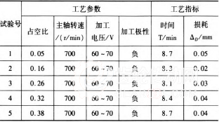 通過設計正交試驗分析了占空比、主軸轉速、加工電壓和加工極性電火花放電刃磨PCD成型螺旋輪胎刀具的加工速度和電極損耗工藝指標的影響,通過極差分析出加工的最優參數組合:粗加工時,加工極性為負極性加工、粗加工開關和精加工開關都打開,粗加工占空比為0.37、精加工占空比為0.26、主軸轉速為700 r/min、電壓維持在60~70 V時,不僅所需加工時間最短,而且對電極的損耗也較小;精加工時,加工極性為正極性加工、粗加工工開關關閉、精加工開關打開占空比為0.38、主軸轉速為700 r/min、電壓維持在50~60 V時,不僅所需加工時間最短,而且對電極的損耗也較小。以上優化的加工參數,對于實際加工具有一定的指導意義。