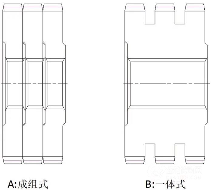 采用成組加工方式,即3個行星齒輪一組,同時拉內花鍵,粗滾外齒,滲碳淬火,精滾外齒,組合方式一般采用整體一體式和單片成組式(圖3)。