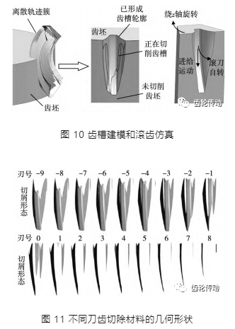 Kadashevich 等提出了一種改進的 dexel 模型,該模型可以描述齒輪的幾何形狀,利用 ABAQUS 有限元軟件解決了熱 - 力耦合問題,避免了預先產生的熱誤差。周力等基于滾齒切削原理,利用 Pro/E 和 Mathematica 軟件建立了高速干式滾齒加工運動關系及三維模型,如圖 10 所示,并使用 De-form-3D 軟件對滾齒過程模型及性能進行研究,仿真與實際滾齒獲得的切屑形態十分相似,間接驗證了仿真試驗方法的準確性,如圖 11 所示,研究結果可為高速干式滾齒加工參數優化提供實際的參考價值。