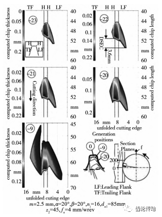Friderikos 等探究了干式滾齒加工中切屑沖擊對切削刃崩刃現象的影響規律,利用仿真得到相鄰位置之間的切屑擠壓,如圖 12 所示,建立了高速干切滾齒加工切屑沖擊理論。Claudin 等根據數 控五軸加工模擬滾刀與齒輪的切削運動,獲得了高速干切滾刀的磨損變化規律,隨著被加工齒輪數量的增加,刀具磨損量逐漸增加,主要分布在頂刃及側刃附近,可為選擇合適的切削優化參數提供參考價值,以減少刀具的磨損量,提高刀具壽命。
