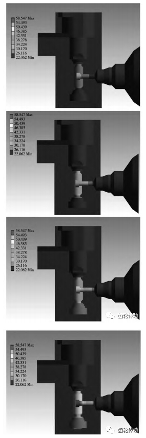 作者根據 Deform-3D 仿真軟件,對高速干式滾齒進行有限元仿真,圖 13 為滾齒切屑形貌及刀齒溫度場仿真圖,仿真結果與實際加工產生切屑基本一致。對前面學者仿真結果進行驗證,切屑形貌與溫度場基本吻合。利用 ANSYS 對滾齒加工刀架與工作臺進行仿真,溫度場如圖 14 所示,可為后續的高速干式滾齒參數優化提供仿真數據,提高優化準確性,對于改善工件質量和提高刀具壽命等有重要的參考價值。