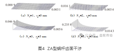 為了對比不同蝸桿頭數對齒面干涉量的變化情況,分別對節圓半徑為 8 mm的 ZA型蝸桿,設置其頭數為 1、2、3和5,與蝸桿完全共軛的斜齒輪(式(14))與標準斜齒輪進行比較,兩個齒面間嚙合干涉結果如圖 4 所示。隨著蝸桿頭數的增加,干涉量也增加了。對于 ZN 型蝸桿,變化趨勢相同。