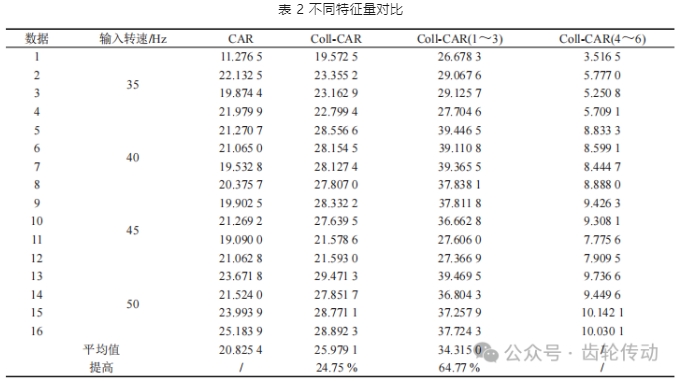 為驗證方法普適性,并探討不同階次組合對故障提升效果表達的差異,計算不同轉速下的16個信號,長度均為1秒,計算結果如表2所示。其中,Coll-CAR表示協同診斷方法下的1~6階故障倒頻幅值的均值與整體均值之比,Coll-CAR(1~3)表示 1~3 階,Coll-CAR(4~6)表示4~6階。