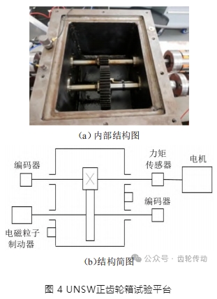 本節采用 University of New South Wales(UN-SW)公開的單級正齒輪箱齒輪磨損全壽命數據集進行分析。試驗平臺內部結構圖和結構簡圖如圖4(a)至圖4(b)所示。該齒輪箱由單級齒輪副、輸入軸和輸出軸構成,各軸對應齒輪齒數分別為19和52,振動加速度傳感器安裝在齒輪箱外殼頂部。分別進行潤滑和干燥試驗用以模擬兩種不同磨損機制。