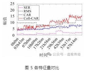 其中潤滑試驗共持續67小時17分鐘,每5分鐘采集一次數據,采樣頻率100 kHz,采樣時長4秒,用以記錄輸入軸上小齒輪的點蝕疲勞擴展過程。選擇分析振動加速度測點1秒數據計算特征量,包括:邊頻能量比(SER)、有效值(Root-mean-square,RMS)、協同方法處理后的倒頻譜能量比(Coll-CAR)、原始信號的倒頻譜能量比(CAR)。各特征量變化趨勢如圖5所示。其中RMS變換范圍為[0.02,0.035],將值擴大 350 倍后與其他特征量共同顯示在同一張圖中。RMS呈現先下降后上升的變化趨勢,在29小時36分鐘后開始階梯式上升,時間較晚且變化范圍較小,不利于監測者發現;SER在前期變化幅度較小,保持穩定,到29小時36分鐘后陡然上升,但到42小時 39 分鐘后又逐步下降,未呈現整體上升趨勢;Coll-CAR和CAR均呈現整體上升趨勢,而Coll-CAR變化更加明顯,該特征量在21小時58分鐘時迅速上升,此時其他特征量無顯著變化,該特征量后期雖有波動,但整體數值大于前半段,前后差異顯著,證明通過協同診斷方法,故障特征得到有效增強,驗證了本文所述方法的有效性與優越性。