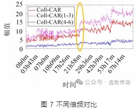 由圖可知,各個特征量數值關系為Coll-CAR(1~3)>Coll-CAR> Coll-CAR(4~6),與表2結果相同。Coll-CAR(1~3)可以看作是 Coll-CAR 的增強特征量,特別是在21小時58分鐘前后(橙色框內),Coll-CAR(1~3)和Coll-CAR均有顯著增長,而Coll-CAR (1~3)的變化更加劇烈,Coll-CAR(4~6)只有微弱波動,證明曲線呈現上升趨勢的主要影響因素為1~3 階故障倒頻幅值的均值,采用 Coll-CAR(1~3)表達故障演化效果更佳。