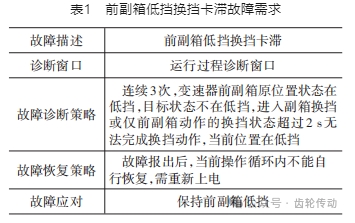 變速器箱體受潤滑油質(zhì)量、零部件損壞等因素影響,可能出現(xiàn)換擋卡滯問題,導(dǎo)致無法正常換擋,進(jìn)而影響車輛行駛。限于篇幅,本文以 AMT 前副箱低擋換擋卡滯故障為例,設(shè)計(jì)自動化序列并開展測試。前副箱低擋換擋卡滯故障需求如表 1 所示。