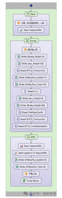 該序列由開始(Start)、流程(Group)和結(jié)束(END)3 個部分組成,分別為上電和開啟模型數(shù)據(jù)記錄、故障診斷測試流程、記錄和分析數(shù)據(jù)。其中,clib 文件為封裝好的通用測試序列庫,可以被多個測試序列反復(fù)引用。上電(起動發(fā)動機(jī)).clib包含上電流程、起動發(fā)動機(jī)和確認(rèn)TCU屬于默認(rèn)初始狀態(tài)測試,下電 .clib 包含下電流程和重置 TCU 狀態(tài)測試,掛 D 擋 .clib 為掛入 D 擋測試。Script Block 為 Python 腳本,用于判定變速器前副箱在低擋是否持續(xù)6 s無法摘出(即故障診斷判斷時間)。