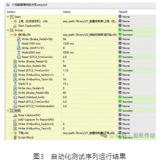 通過以上方法,可將AMT故障診斷測試用例轉(zhuǎn)化為對應(yīng)測試序列。在進(jìn)行TCU故障診斷測試時,只需在更換TCU軟件后運(yùn)行該序列,即可自動完成故障診斷測試并生成測試報(bào)告。