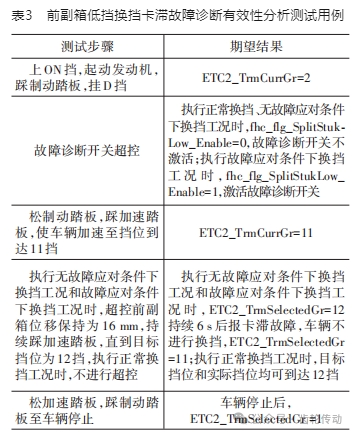 搭建高速行駛工況下正常換擋、無故障應(yīng)對條件下?lián)Q擋和故障應(yīng)對條件下前副箱低擋換擋3種工況,不同工況下的測試用例如表 3 所示。其中,fhc_flg_SplitStukLow_Enable為前副箱低擋換擋卡滯故障開關(guān)標(biāo)定值。