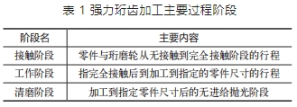 強(qiáng)力珩齒工藝是珩磨輪主軸和工件主軸分別通過電主軸驅(qū)動,同時通過控制系統(tǒng)實現(xiàn)高度同步,加工過程工件沿軸向往復(fù)運(yùn)動同時工件徑向進(jìn)給。利用嚙合處的相對滑動,并在齒面間施加一定的壓力來進(jìn)行磨削加工。表 1 列出了強(qiáng)力珩齒的幾個主要過程階段。