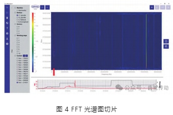 完成篩選后的數(shù)據(jù)依然是以列表的方式顯示,為了更加直觀地發(fā)現(xiàn)加工過程的異常,還需將列表數(shù)據(jù)轉(zhuǎn)換為光譜圖形式顯示。圖 4 通過顏色從淺到深的色差,可以更便捷地看到一些特征頻率和加工過程中出現(xiàn)高幅值的區(qū)間。