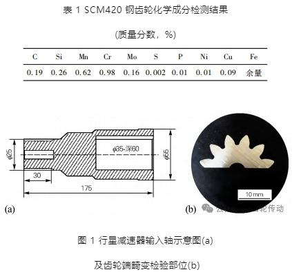 試驗零件為機器人行星減速器中的輸入軸,材料為 SCM420 鋼,主要化學成分見表 1,符合JIS G 4053- 2008 Low-alloyed steels for machine structural use 要求。圖 1 為輸入軸簡圖和齒部畸變檢測位置。