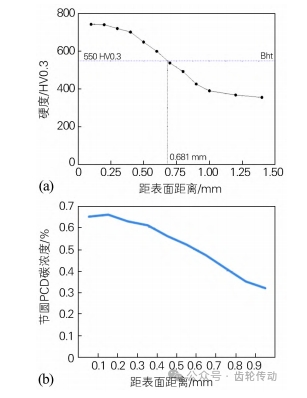圖 4 行星減速器輸入軸滲碳層硬度分布曲線(a) 和相應的碳濃度分布曲線(b)