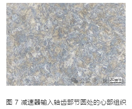 圖 7 為輸入軸齒部節圓處的心部組織照片。如圖 7 所示,輸入軸滲碳淬火后心部組織級別為 1 ~ 2 級。