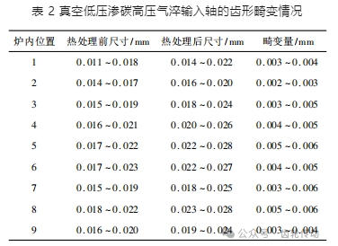 表 2 為輸入軸真空低壓滲碳高壓氣淬后齒形的畸變情況。由表 2 可見,該軸齒類零件在圖 2 所示的各測試點,畸變量全部控制在 0.005 ~ 0.015 mm 之內。