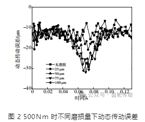 當發生全齒磨損故障時,對各載荷進行動態傳動誤差測試得到圖 4 結果。對圖 4 進行分析可以發現,逐漸提高齒面磨損量時,形成了更大的動態傳動誤差。當載荷提高后,曲線可以在更短時間內進入穩態階段,大幅減小了波動性,形成了更大的動態傳動誤差 γ 絕對值。
