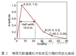 有限元數值模擬中壓力隨時間變化曲線如圖 2 所示,該幅值曲線為本工作所用激光沖擊強化的激光器參數,即與實驗所用激光器參數一致。圖 2 中幅值曲線與峰值壓力 P0 的乘積為壓力隨時間的變化關系 P(t)。