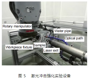 激光沖擊強化實驗在西安天瑞達光電有限公司進行,實驗設備如圖 5 所示。實驗在 YD60- M165 設備系統上進行,該系統主要由高性能脈沖激光器、控制系統、水約束系統、吸收保護層及監控系統組成。其中激光器為 Nd:YAG 型高能激光器,能量呈高斯分布,沖擊強化過程中激光束處于固定狀態,多自由度機械臂可以控制夾持試樣連續移動,按照規劃路徑實現整個強化過程。采用水作為吸收保護層,防止 9310 齒輪鋼表面在強化時與高能激光直接接觸。本工作采用 3、4 J 和 5 J 三種激光能量對 9310 齒輪鋼進行實驗。激光脈寬 20 ns,波長 1064 mm,光斑搭接率(光斑搭接距離與光斑半徑比率)為 50%,激光能量為 5 J 時,光斑直徑為 2.2 mm,即圖 3 中第 2 層相對第 1 層平移50% 的沖擊強化痕跡直徑為 2.2 mm。
