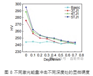 圖 8 為不同激光能量沖擊材料表面的顯微硬度分布圖。通過對比圖 8 所示的激光沖擊強化前后試樣的顯微硬度可以發現,激光沖擊強化后,試樣表層顯微硬度最大,經過激光沖擊強化后,試樣 表層顯微硬度得到明顯提高。9310 齒輪鋼基體的顯微硬度為 244.5HV,當激光能量為 3、4 J 和 5 J 時,試樣經過激光沖擊強化后顯微硬度分別提高到 275.6、288.2HV 和 294.8HV,比基體試樣分別提高了 12.7%、17.9% 和 20.6%。當激光能量從 3 J 增加 到 4 J 時,表層顯微硬度提高了 4.5%;當激光能量從 4 J 增加到 5 J 時,表層硬度則僅提高了 2.2%,顯微硬度增大和激光能量增加表現出非線性相關的特征,這與殘余壓應力的情況相類似。由圖 8 可以看出,顯微硬度在 200 μm 深度處出現迅速下降的情況。當激光能量為 3 J 時,在 500 μm 深度處獲得與基體相等的顯微硬度。在激光能量為 4 J 和 5 J 時,也觀察到類似的變化趨勢,顯微硬度影響層深度達到 600 μm。