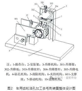 齒輪是汽車行業中主要的基礎傳動元件,通常每輛汽車中有18~30個齒部,齒輪的質量直接影響汽車的噪聲、平穩性及使用壽命。而對于汽車變速箱內的傳動齒輪,為方便變速箱內部冷卻油液的流通以及更好地潤滑齒輪內安裝的滾針軸承,潤滑的充分性至關重要。如果潤滑不到位,則容易出現燒齒、打齒、抱軸等故障現象,由此可見,齒輪油孔的加工質量對于保障齒輪的正常運作具有重大影響。齒輪油孔加工需要通過鉆孔設備對齒輪進行鉆油孔加工,而鉆孔設備對齒輪鉆孔加工的過程中,伴隨著對齒輪由外向內的切削,在齒輪油孔的內孔處易產生毛刺翻邊等問題。針對上述問題,提出一種全新的汽車齒輪零件加工鉆孔去毛刺一體化裝置,以提高汽車齒輪油孔加工質量與效率。
