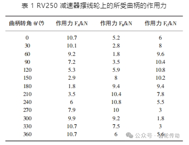 根據相關計算得出相應的 RV 減速器不同曲柄轉角 θ 時,擺線輪上的所受曲柄的作用力大小,如表 1 所示。