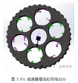 對 RV 減速器擺線輪施加約束、載荷。再對其劃分網格,在擺線輪齒廓處適當加密網格有利于反應真實的嚙合狀態,如圖 5 所示。然后應用拓撲優化求解。