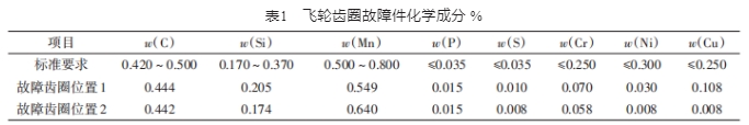 對2個故障齒圈材料成分進(jìn)行檢測,飛輪齒圈故障件化學(xué)成分見表1。由表1可以看出:各種元素的材料成分均符合45號鋼的標(biāo)準(zhǔn)要求。
