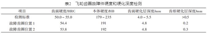 飛輪齒圈齒頂需進(jìn)行淬火處理以保證有足夠硬度與發(fā)動機(jī)小齒輪嚙合,要求淬火后齒面洛氏硬度為50~55 HRC。對故障飛輪齒圈硬度進(jìn)行檢測,結(jié)果見表2。