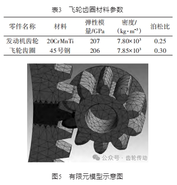 起動機(jī)齒輪材料為20CrMnTi,飛輪齒圈材料為 45號鋼,材料參數(shù)見表3。對飛輪齒圈進(jìn)行有限元分析,模型截取飛輪齒圈和發(fā)動機(jī)齒輪數(shù)模,導(dǎo)入Ansys Workbench進(jìn)行網(wǎng)格劃分,對接觸齒輪嚙合部分進(jìn)行局部網(wǎng)格細(xì)化(網(wǎng)格尺寸為0. 2 mm),劃分好的有限元模型如圖5所示。