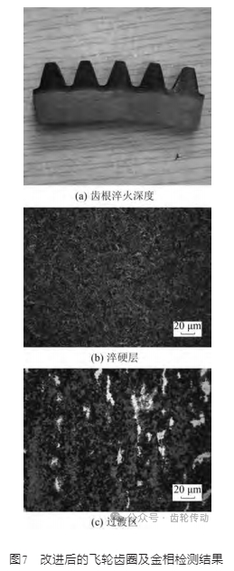 結(jié)合理化性能檢測、斷口分析和有限元分析結(jié)果,失效齒圈沿齒根整齒折斷,與齒根無硬化層而導(dǎo)致的彎曲疲勞強(qiáng)度不足有直接關(guān)系。為此提出改進(jìn)措施:① 將齒圈淬火深度加深至齒根圓以下1~ 2 mm;② 齒根過渡圓角半徑從原來的1. 0~1. 5 mm 加嚴(yán)至1. 3~1. 5 mm。隨后將上述2項改進(jìn)建議通過圖紙予以固化,并下發(fā)供應(yīng)商嚴(yán)格執(zhí)行。圖 7(a)為改進(jìn)后的飛輪齒圈,經(jīng)檢測其齒根淬硬層厚度為1. 7 mm,齒面淬硬層深度為 7. 8 mm;圖 7(b)、(c)為抽檢改進(jìn)后飛輪齒圈的金相組織檢測云圖,其中淬硬層為馬氏體組織,過渡區(qū)為回火馬氏體+屈氏體+鐵素體。為進(jìn)一步驗證改進(jìn)效果,對齒圈開展齒向疲勞試驗和齒沖擊試驗。試驗結(jié)果表明,改進(jìn)后的飛輪齒圈未出現(xiàn)裂紋和斷裂,各項指標(biāo)均合格。