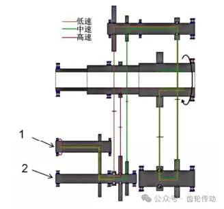 通過機(jī)床的實(shí)際運(yùn)行工況,用Romax Designer軟件進(jìn)行描述機(jī)床傳動(dòng)系統(tǒng)運(yùn)動(dòng)平面簡(jiǎn)圖,并標(biāo)注低速、 中速、高速3種運(yùn)動(dòng)工況的運(yùn)行狀態(tài),3種運(yùn)動(dòng)工況的運(yùn)行狀態(tài)如圖2所示。材料為中碳鋼,楊氏模量為2.07×105MPa,密度為7800 kg/m3,泊松比為0.29,屈服強(qiáng)度為380MPa,抗拉強(qiáng)度為 660MPa。