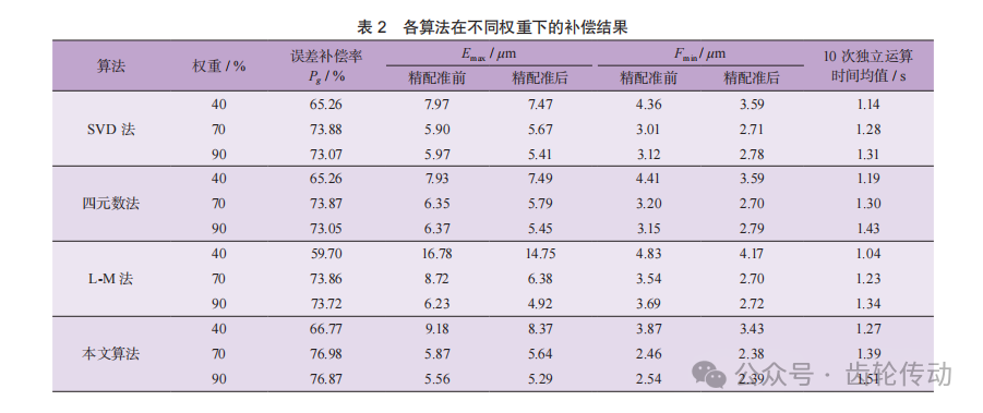 精配準后,將基于SVD法、四元數法、L-M法和本文算法進行配準的ICP迭代法的最終誤差補償結果進行分析,根據式(18)給出了各算法模型權重分別為40%、70%和90%時的誤差補償數據結果,并得出各算法10次獨立運算時間的均值,如表2所示。由表可得,各算法在權重k為70%時,補償效果最佳,且本文算法相較于SVD法、四元數法和L-M法進行ICP迭代補償后的最高誤差補償率分別提升了3.09%、3.10%和3.12%。權重k為70%時,在粗配準階段,SVD 法、 四元數法、L-M法和本文算法的最大誤差由補償前的22.11μm分別補償至 5.90、6.35、8.72 和5.87μm,再進一步進行精配準補償至5.67、5.79、6.38和5.64μm,測量齒面與理論齒面對應點平均誤差從10.34μm分別補償至2.71、2.70、2.70和2.38μm;本文算法相比于其他3種算法平均耗時增加了0.14、0.08和0.18s, 這是由于運行算法的過程中需要調用工具箱Sedumi求解。