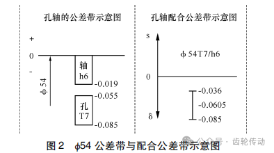 輪轂與小軸頸、減振皮帶輪的精度設計:如圖1所示,曲軸齒輪套裝在大軸頸上,輪轂再套裝在小軸頸上,為避免熱壓裝配過程中對結合面的損傷,大小軸頸的截面做成階梯狀,可以使曲軸齒輪順利穿過小軸頸,為此選擇小軸頸的直徑為φ54。作為轉接件,輪轂起著連接曲軸前端與減振皮帶輪的橋梁作用,可以減少曲軸種類、降低工藝復雜性,以及更好的適應減振皮帶輪的多樣性。考慮前端附件的負載功率、配套輪轂的多變性和曲軸小軸頸的統一性,可采用基軸制配合,選擇輪轂過孔與小軸頸的配合代號為φ54T7/h6,它比較接近于重型壓配,可產生相當大的結合力,同樣采用熱壓裝配工藝。輪轂要求在溫度為400℃加熱爐中,保溫30min,熱壓到曲軸前端,壓至與曲軸齒輪貼合。圖2所示為輪轂過孔與小軸頸的公差帶與配合公差帶示意圖,s表示間隙,符號為正;δ表示過盈, 符號為負。它的選擇邏輯如下: