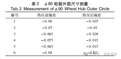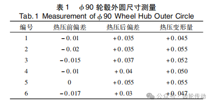 (2)沒有受到任何約束,即可以自由膨脹或收縮。在本文中,在將輪轂熱壓裝配到小軸頸后,接下來進行的冷卻收縮過程,顯然不是自由收縮過程,它受到了小軸頸的阻礙作用,形成了所謂的過盈配合。那么,這就意味著輪轂上φ90h6的尺寸,在經過熱壓裝配后會被脹大,結果就會導致減振皮帶輪止口處裝配困難,也就是出現了軸大孔小不容易裝配的情況。實際上,輪轂外圓與減振皮帶輪的止口按φ90H7/h6加工后,在生產過程中確實發生了裝配困難的現象,圖紙上輪轂φ90h6的公差帶為[-0.022~0],熱壓裝配前后測量相關數據如表1所示。熱壓前外圓直徑偏差測量數據均在公差[-0.022~0]的區間范圍內,熱壓后外圓直徑全部超差,熱壓變形量為+0.045~+0.055之間。通過圖2我們可以知道,φ54T7/h6配合的平均過盈為-0.0605。為補償熱壓變形量,將輪轂Ф90h6的上下極限偏差均減小0.06,這時極限偏差修正為[-0.082~-0.06],保持減振皮帶輪止口φ90H7不變。按這個修正公差帶再次加工并裝車驗證,之前裝配困難的問題得到了順利解決。