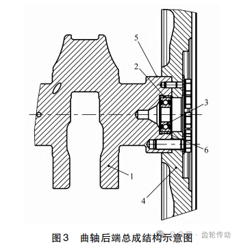 如圖3所示,曲軸后端總成包括:1、曲軸后端,2、擋環,3、滾動軸承,4、飛輪,其中在曲軸后端還布置有后軸頸5(直徑φ54)、后端內孔6(直徑φ52)等。